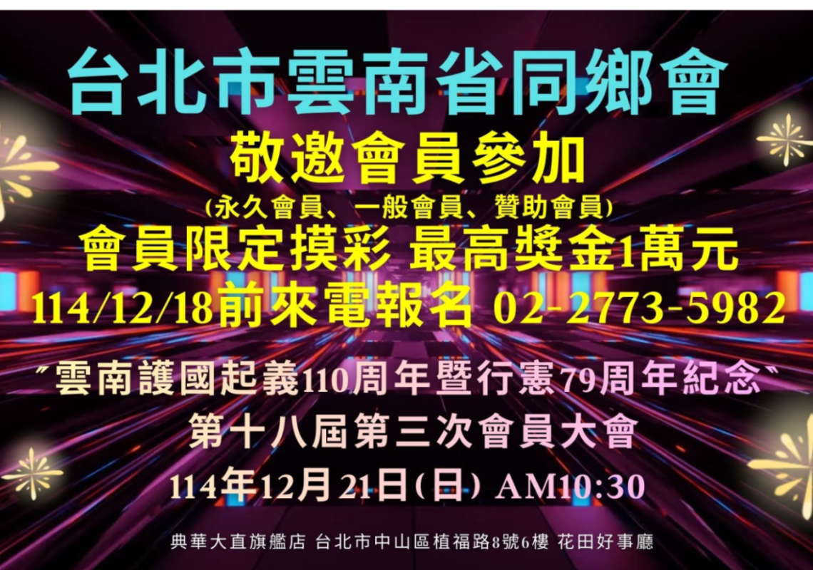 敬邀參加 雲南護國起義110週年與行憲79週年紀念 暨台北市雲南省同鄉會第十八屆第三次會員大會